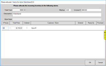 - At the top enter the Total Cost (for entire shipment), Markup, Invoice, and Description. Then in the main window enter the # Pieces. Total Price will automatically be calculated using the cost and mark up entered.