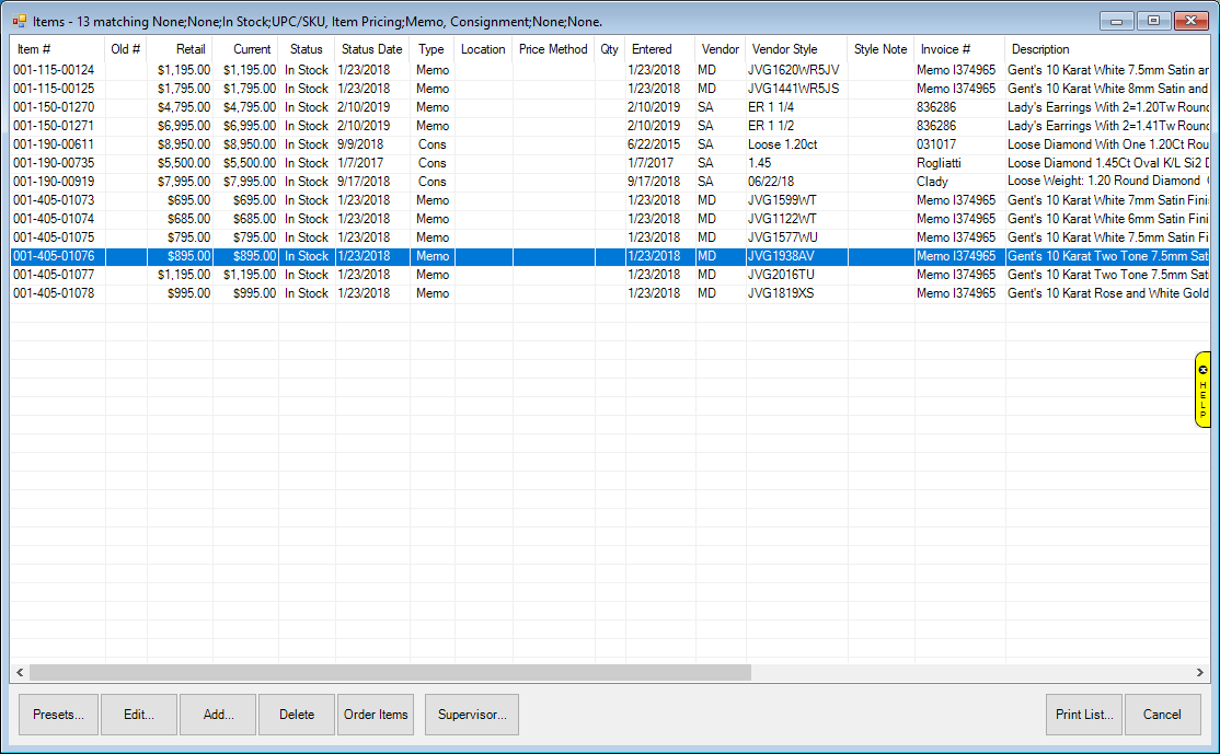 To work with Consignment and Memo items, for example, to determine what payments are due, use the Item Find feature. In the Type & Status tab, under Inventory Type, deselect Inventory and select Memo or Consignment. You can also specify the dates or a specific owner or vendor.