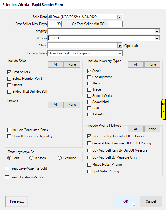 The Reorder Form performs several ordering functions based on the selection chosen in the Include Sales section. To run this form, you must choose at least one checkbox in the Include Sales criteria. Additionally, checking multiple options will return all items that match either, and also identifies those items that match multiple criteria.