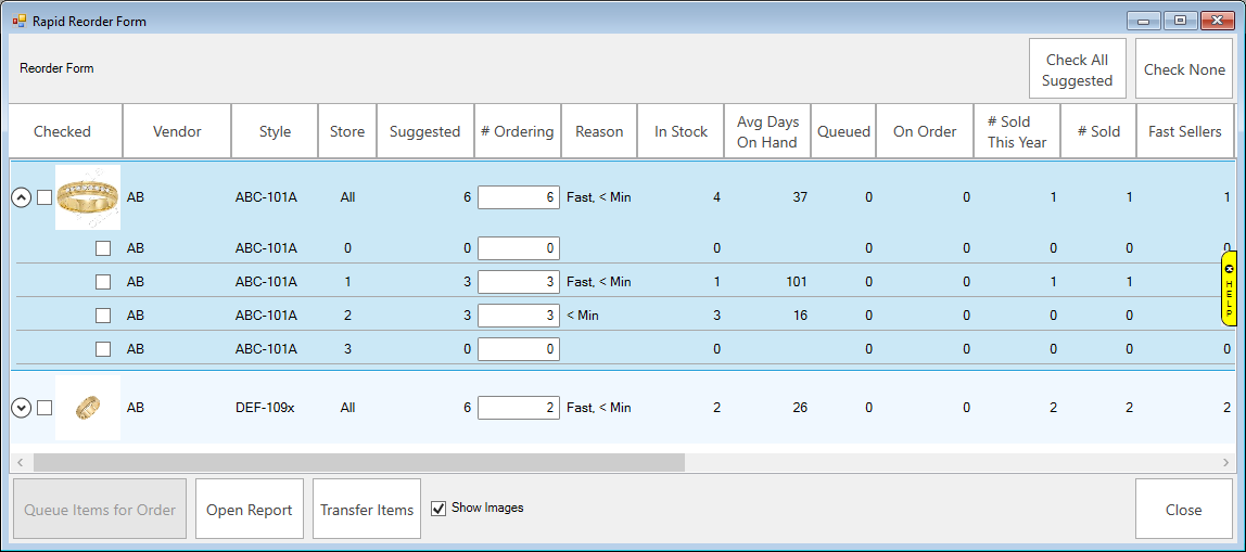 Note: Suggested Fast Sellers are NOT taken into consideration when calculating stock level suggestions. This means if you are out of stock on a particular style, have sold 1 qualifying item fast, and have a minimum level of 2, The Edge will suggest ordering 3. 1 to replace your fast seller and 2 to maintain stock level.