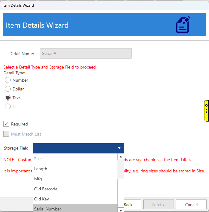 - Select Text and Storage Field 'Serial Number'. You can choose to make it required. Click Next, then Save, then Finish to complete the process.