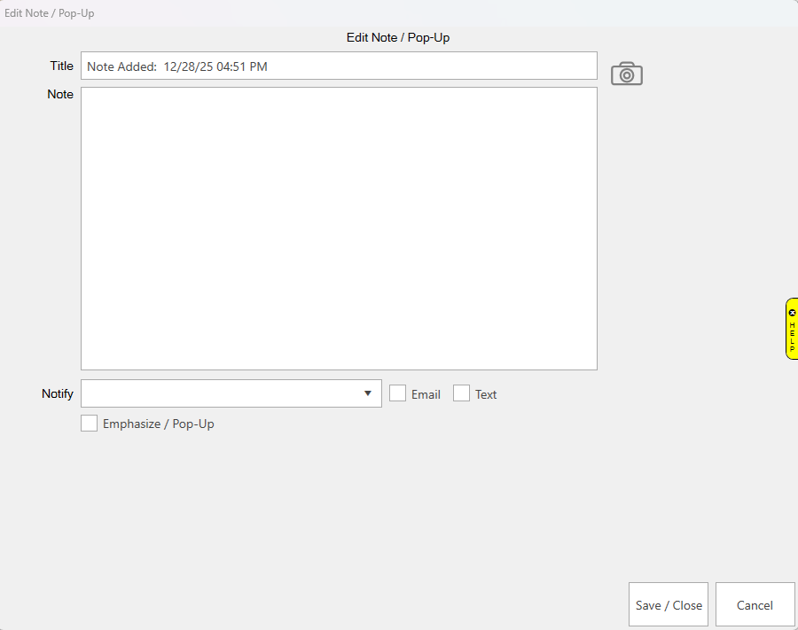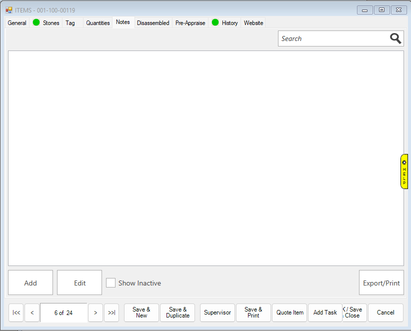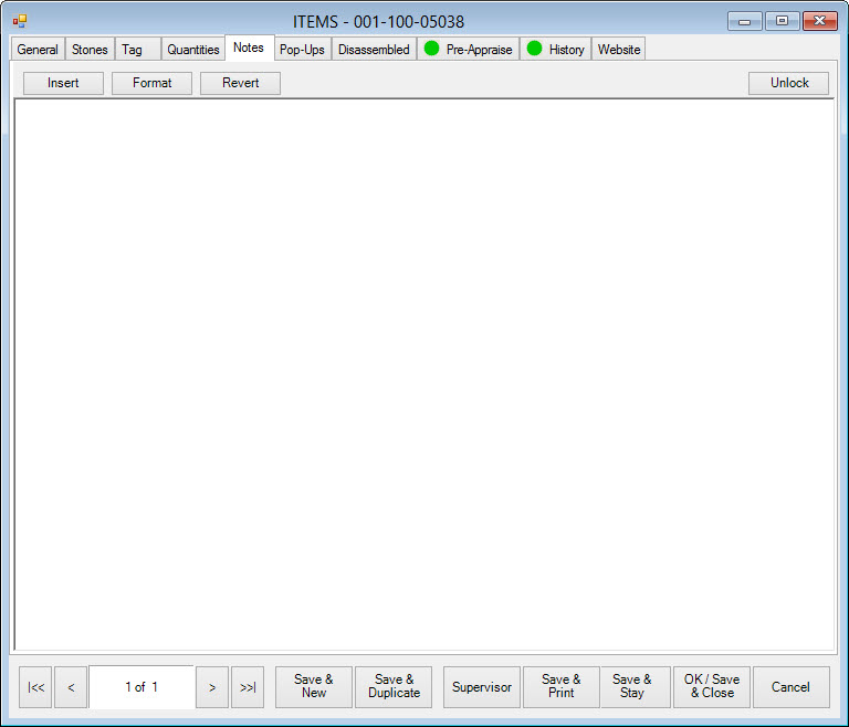 The Notes tab allows you to enter miscellaneous information about the item. Notes will be available at point of sale (POS) when the item is inserted into a sale line. This is indicated when the More button on the Point of Sale window is green.