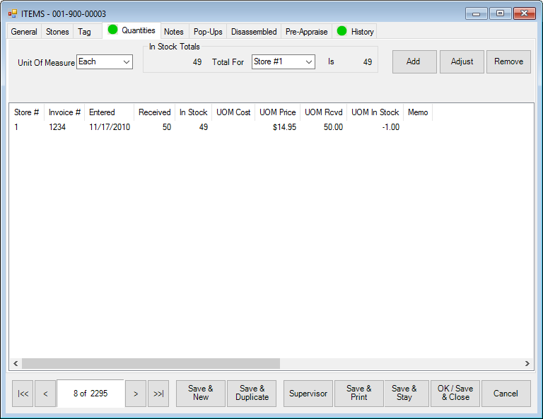 - Find the item with which you wish to work and open the Quantities tab.