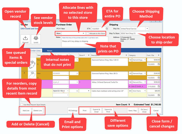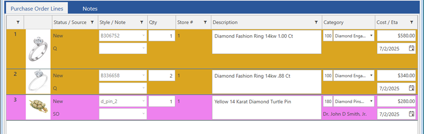 A separate PO line is created for each style. It is possible to add the same style more than once. This might be because you are fulfilling a special order and ordering the same style for stock, or for a multi-store you could be ordering styles and locking down store allocations (remember leaving store blank lets you pick when you receive).