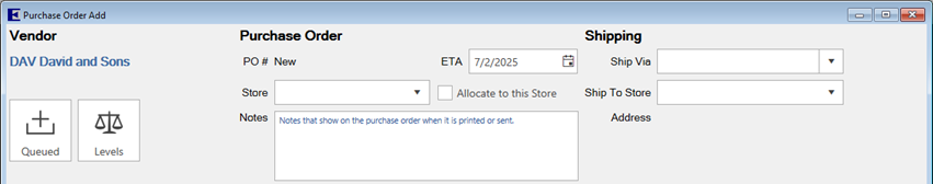 Opens the vendor’s style Levels in a separate detached window. This gives you a snapshot of current inventory levels to help in making purchasing decisions. You can also add styles to the PO from this window.