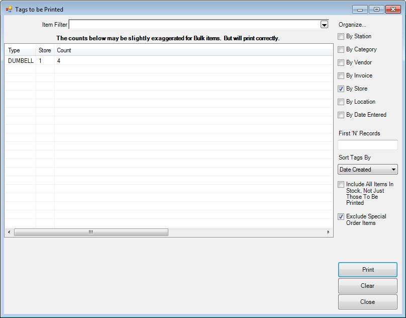 NOTE: By selecting Include ALL items in stock, Not Just Those to be Printed and/or Exclude Special Order Items, you can print all tags within the system sorted per your specifications.