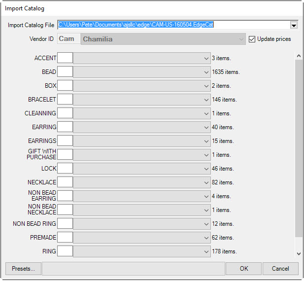 - Check Update Prices if you want the catalog import to update pricing on existing items from this vendor. This will only work if your vendor style numbers exactly match those used by the vendor.