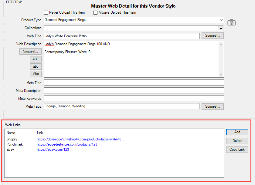 - You can only have one link per type. The software will automatically hide link types already used. For example, if you create an eBay link, the next time you click Add, that link will be unavailable for use a second time.