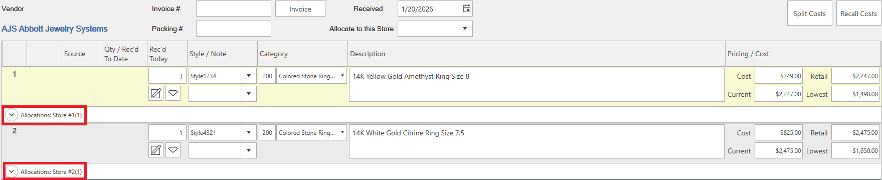 When using Rcv Invoice, the items will automatically allocate to the store they were assigned on the PO.