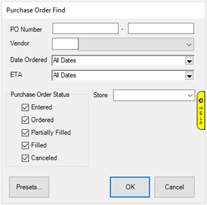 - Enter criteria and click OK. A list of matching POs will be returned.