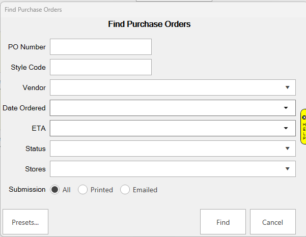 - Enter criteria and click FIND. A list of matching POs will be returned.