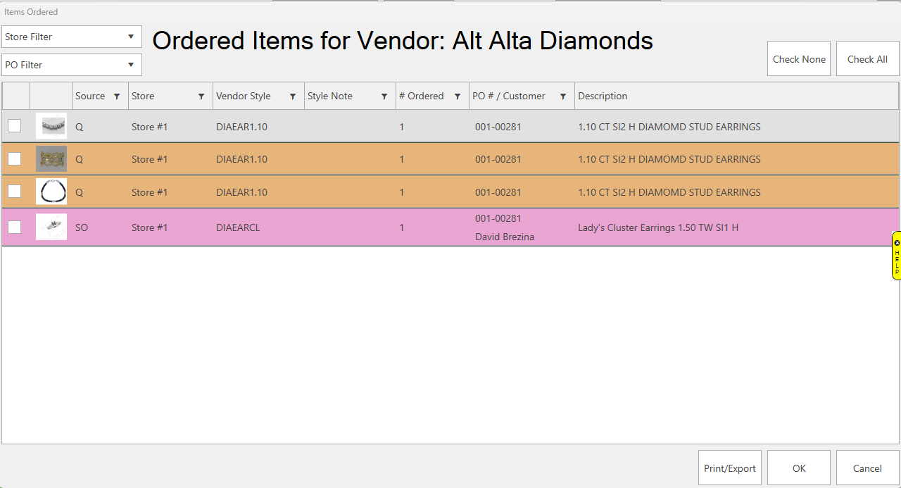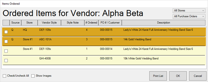 - The Items Ordered window will appear showing all ordered items for this vendor.