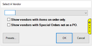 - Use the drop-down to select the vendor. To limit choices to only those with outstanding ordered items, check the first box.