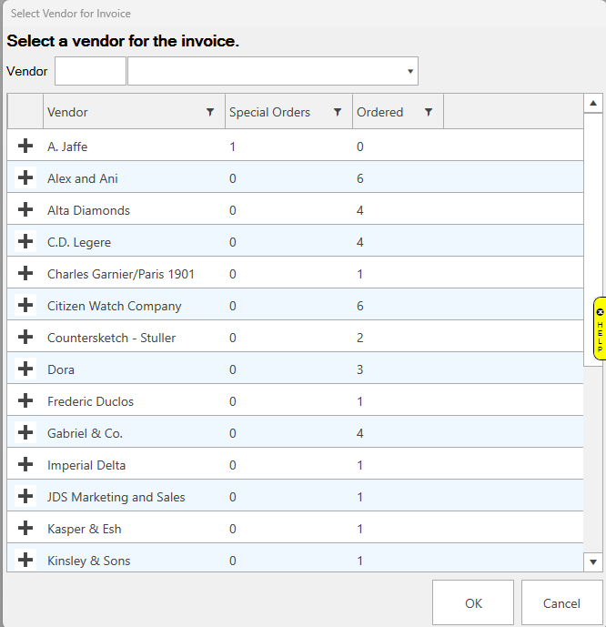 - Use the drop-down to select the vendor. The partial list below shows items on order and special orders.