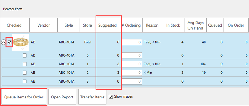 When the Reorder Form/Report is run to include Styles Below Reorder Point any styles below the Max quantity will display with a suggested order quantity to replenish to Max quantity.