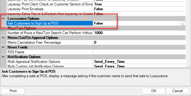 - Search or scroll down to the Luxsurance Options section and locate the option named Ask Customers to Sign Up at POS.