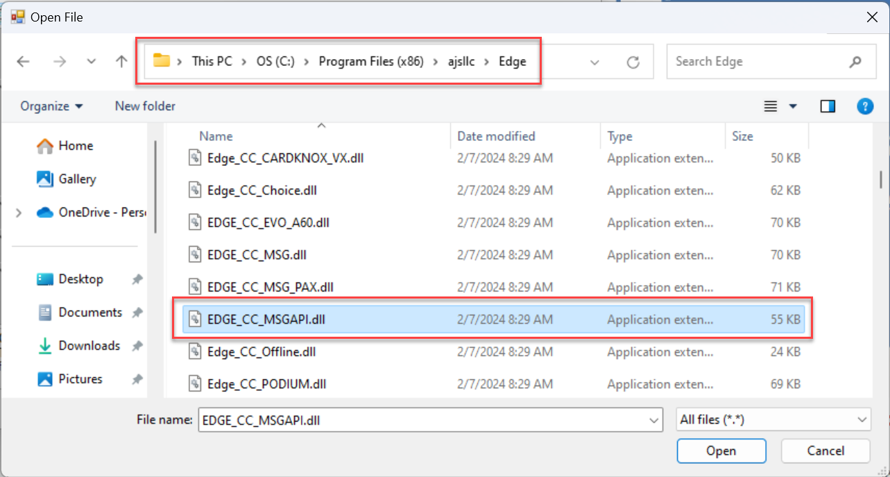 - The Open File window will open. Navigate to the folder C:\program files (x86)\ajsllc\Edge and select the file Edge_CC_MSGAPI.dll, then click Open.
