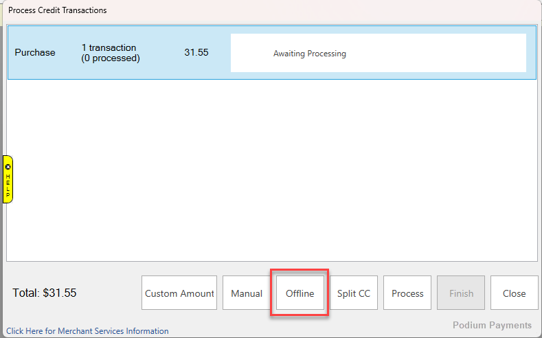 The Offline button can be accessed from the Process Credit Transactions screen. Click HERE to learn more about how to process credit card transactions using the Process Credit Transactions screen.