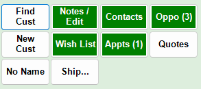 If an area has activity on record for the customer, the button will be green. Buttons may vary based on customer activity. For example, the Rewards button becomes green when there is a rewards balance and even lists the amount of balance.