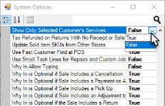 The System Option labeled Show Only Selected Customer's Services controls how layaways, special orders, repairs, custom jobs, and memos will appear in the Payment and Pick Up screens.