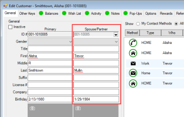 The Spouse/Partner field on the General tab of the customer record allows you to link two customer records so you can track, and market to them, as a couple. Although linked, The Edge still maintains a separate record for each customer.