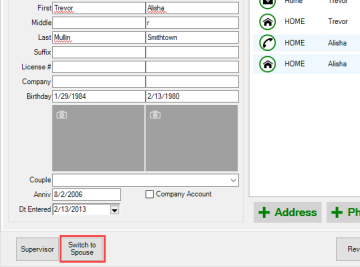When looking up a customer individually you have the option to switch to their spouse at POS by clicking Notes/Edit and using the Switch to Spouse button in the lower left of the customer record.