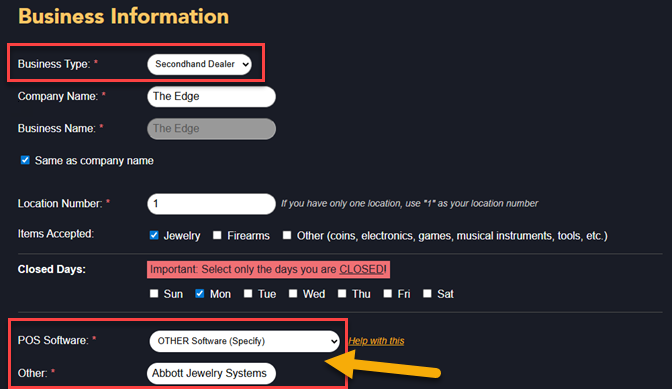 - With some exceptions, most stores will select Secondhand Dealer for Business Type.