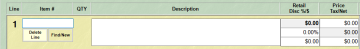 - Key in the item number or use the Find/New button to either search for the item or to enter a new item. The item details will appear on the sale line.
