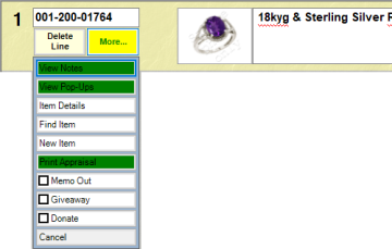 Found on each item sale line, the More button contains additional options for this item. Options will be colored green if there is underlying information present (i.e. if there is a note then View Notes will be green).