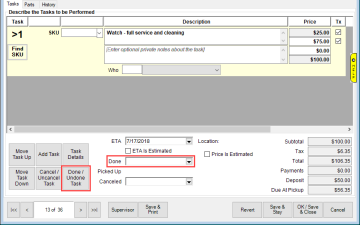 By default, all tasks on a repair must be marked as done before it will be available for pick up. Tasks can be individually marked as done or, if you scan/enter the job or envelope #, you have the option to mark all tasks done at once.