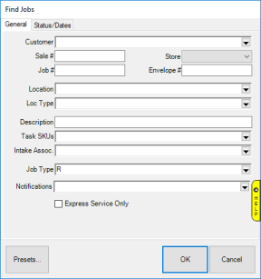 - Click Services > Find > Job. The Find Jobs window will appear with the General tab selected.