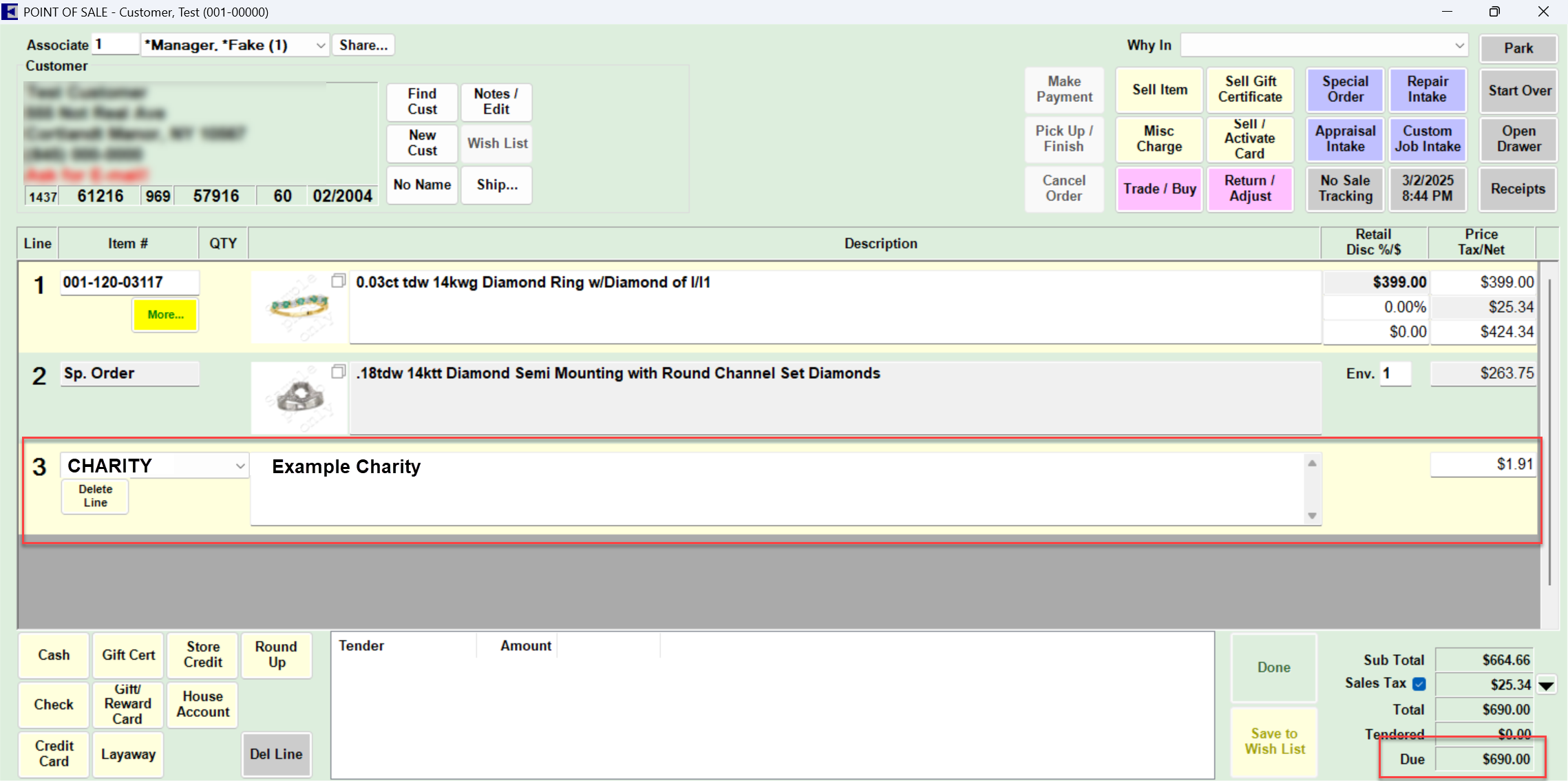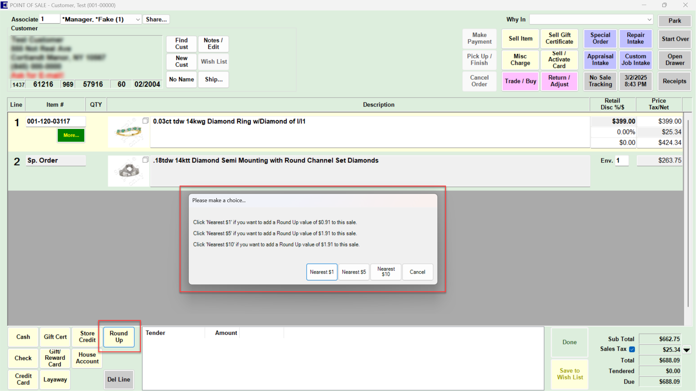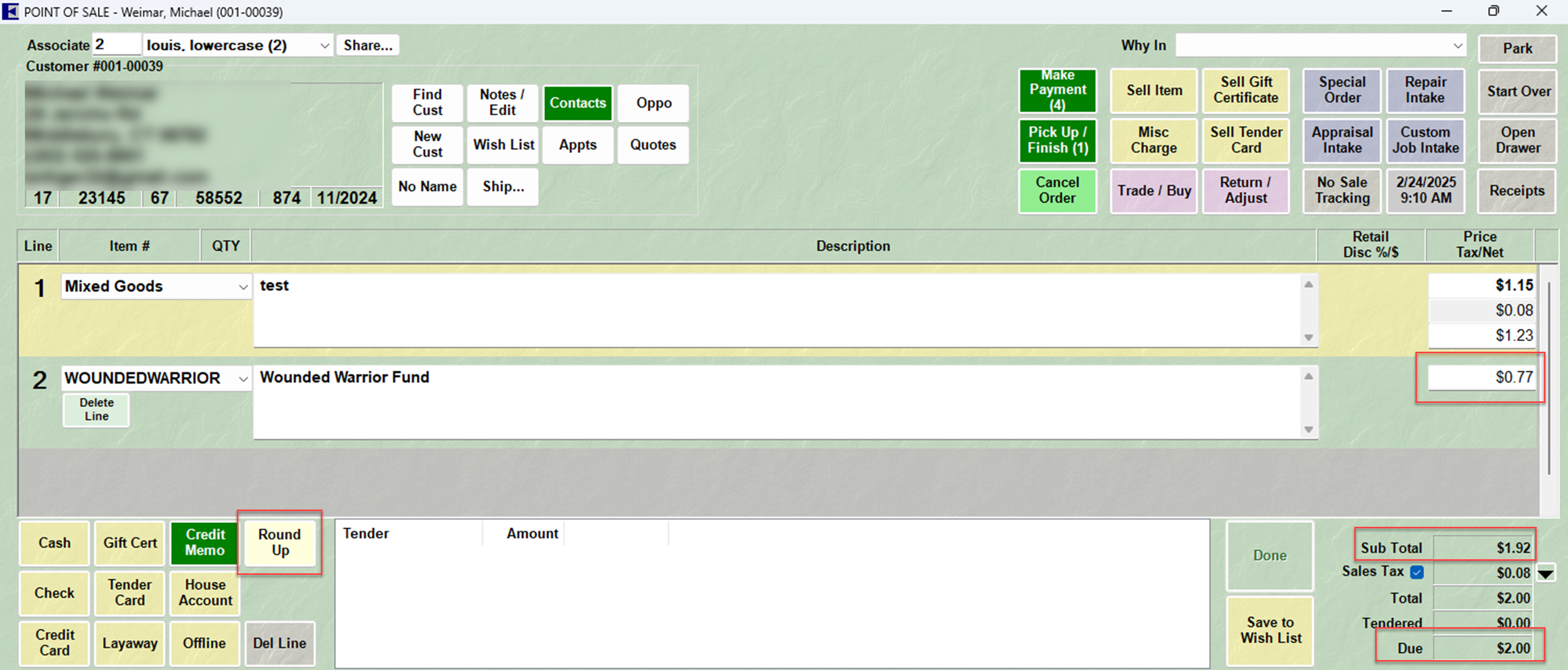 Using the Round Up button at POS works just like any other sale at POS. First, you will find the customer and select the associate, as normal, then begin your transaction by adding your desired salelines.