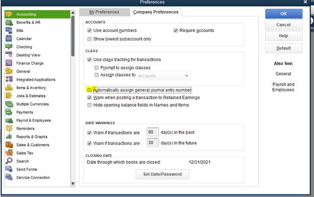 - Under Accounting, choose the Company tab. Uncheck the box next to Automatically assign general journal entry number.