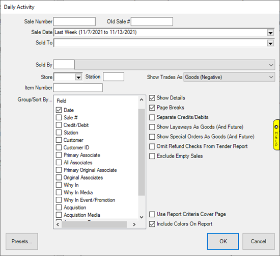 As with other reports, the Daily Activity report can be grouped multiple ways using the Group/Sort by... window. Decide which information field is displayed first by checking the box for your choice, then clicking and dragging to the top of the list.