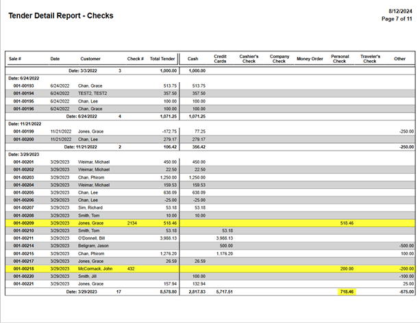 Transactions will only be shown in the Checks Tender Detail Report if they match one or more of your selected payment types. If a transaction was paid using multiple payment methods and one or more match your selections, it will be included, and any payment methods that did not match your selections will be lumped together in the Other column.