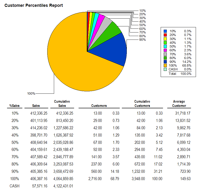 The first row of this example shows us that 10% of our total sales for the period ($412,336) came from just 13 customers and that, on average, each of these customers spent $31,718 at your store. To see who these customers are click on the Cumulative Sales number for that row.