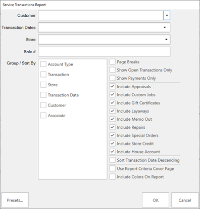 The Service Transactions report will show selected transaction types along with their payment history, amount on account, and current balance. It can be filtered by customer, transaction date, and can also be run for a specific transaction (sale #).