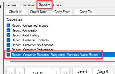 Visit the Security tab on the Associate record that should have permission to run this report, and either search or scroll until you find the Customer Recency, Frequency, Monetary Value Report permission. Check the box and select a Save option to apply your changes.
