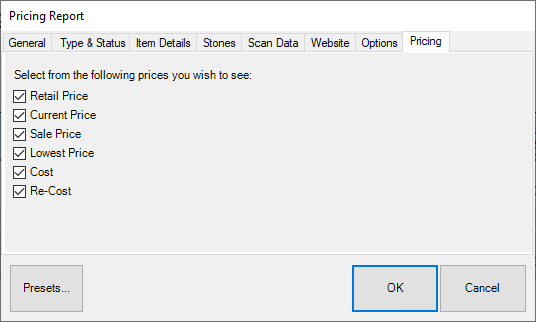 The Pricing Report is run the same way as any other inventory report, but is formatted specifically to show pricing details.