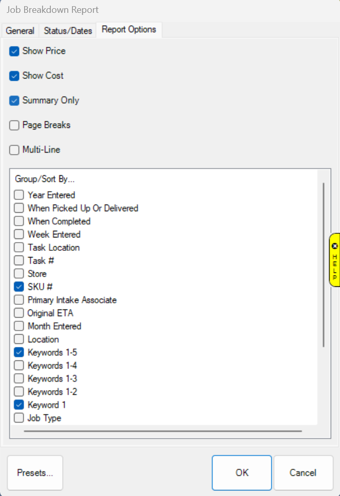 The Job Breakdown report details the cost of parts and labor for service jobs in Edge. A useful feature of this report is the variety of grouping options available.
