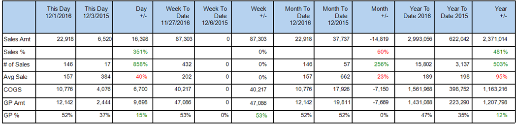 This report allows you to compare sales made on two separate days. By default, when you enter a Compare Date it will auto-fill the Compare To Date field with the date for the same day of the week last year.