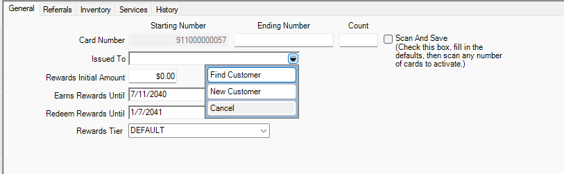 Note: If you want to set up multiple cards and then activate them at POS with these settings. If you do fill out the issued to customer field and the referred by customer field the card will default to a rewards card and will not pay out on the referred by because it will not be a new customer at this point.