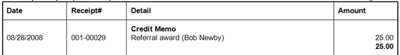 Referral rewards show up on the referring customer’s statement under the credit memo account.  The credit will be identified as to who the new customer was.
