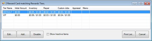 - The Reward Card screen will appear listing tier types. Tiers are reward levels, such as Gold, Platinum, etc. Tiers can be set up to define a category of sorts for rewards.