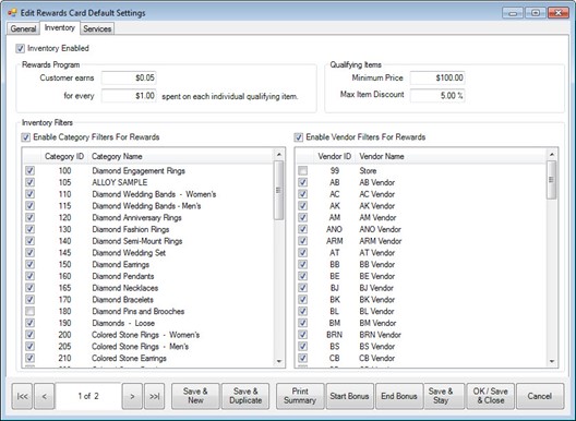 | Vendor Filters | If enabled, allows you to indicate that items from specific vendors pay out rewards.  If you check the box, the items from this vendor will pay rewards.  If you uncheck the box, it will not pay rewards.  Note: If you want to select all or none, right click and select Check All or Check None.