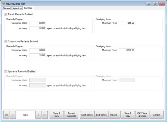 The Services tab functions the same as the Inventory tab but allows rewards to be paid out on specified repairs, custom jobs, and appraisal services.