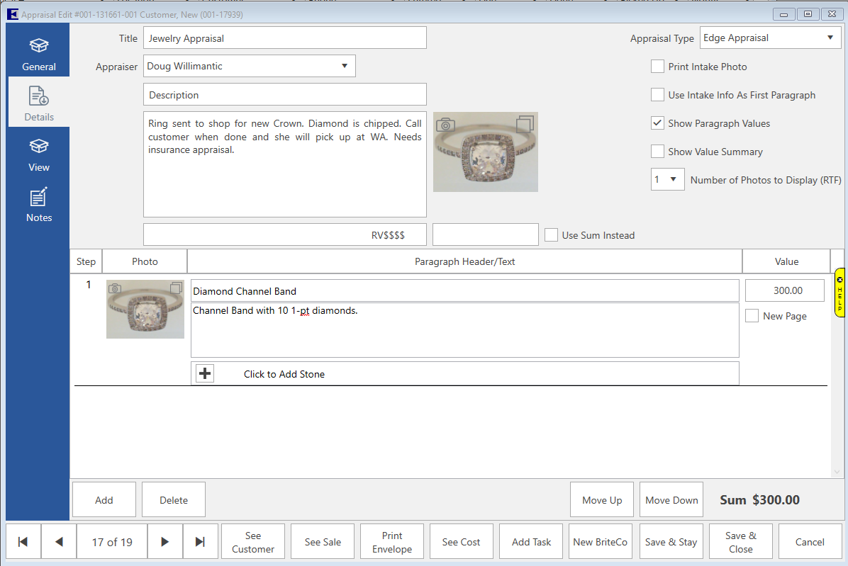 Click this to bring up the Add Stone form. Stone information and scales will not print on the appraisal if no stones are added.