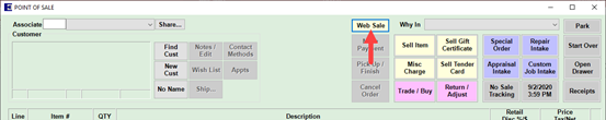 Sales made on Shopify will be automatically imported and the Web Sale button will be illuminated at the top of the POS window. Remember, you must be logged in as the web store (default 98) to see this.