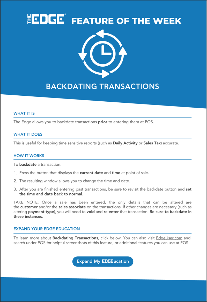 6 August Feature of the Week August 6, 2025 By Angela Chiaravalle Software, Training Feature, POS, Point of Sale, Training Related Articles 6 April Feature of the Week Click to learn more about this week's Edge Feature of the Week: QuickBooks! 20 April Feature of the Week Click to learn more about this week's Edge Feature of the Week: Pre-Appraisals! 27 April Feature of the Week Click to learn more about this week's Edge Feature of the Week: Appraisals! 4 May Feature of the Week Click to learn more about this week's Edge Feature of the Week: Shopify! 11 May Feature of the Week Click to learn more about this week's Edge Feature of the Week: Departments 18 May Feature of the Week Click to learn more about this week's Edge Feature of the Week: Task Automation Back