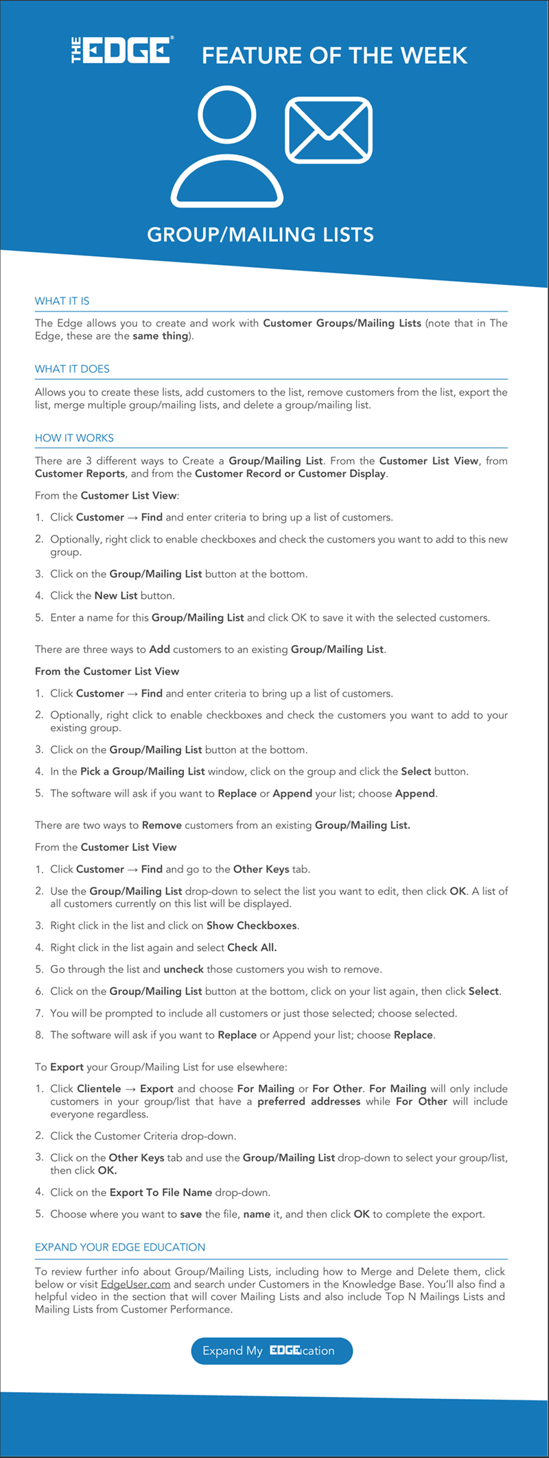 24 September Feature of the Week September 24, 2025 By Angela Chiaravalle Software, Training Training, Feature, Customers, Lists, Mailing Lists Related Articles 6 April Feature of the Week Click to learn more about this week's Edge Feature of the Week: QuickBooks! 20 April Feature of the Week Click to learn more about this week's Edge Feature of the Week: Pre-Appraisals! 27 April Feature of the Week Click to learn more about this week's Edge Feature of the Week: Appraisals! 4 May Feature of the Week Click to learn more about this week's Edge Feature of the Week: Shopify! 11 May Feature of the Week Click to learn more about this week's Edge Feature of the Week: Departments 18 May Feature of the Week Click to learn more about this week's Edge Feature of the Week: Task Automation Back